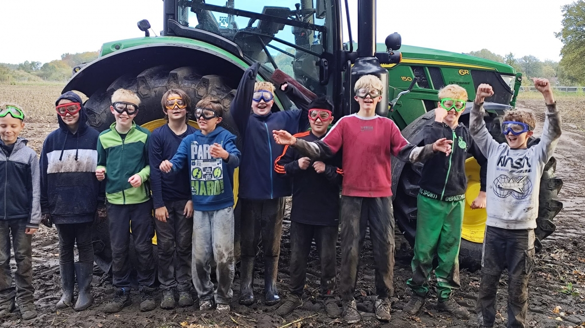 Dort wartete das Highlight: ein Surfbrett, gespannt hinter dem Trecker, bereit für den wilden Ritt über Wellen, Stoppeln und matschige Kreisel. Nach einer kurzen Sicherheitseinweisung und ausgestattet mit Schutzbrillen ging es los – und spätestens als der letzte Surfer im Matsch landete, war klar: das wird ein Tag, den keiner so schnell vergisst.